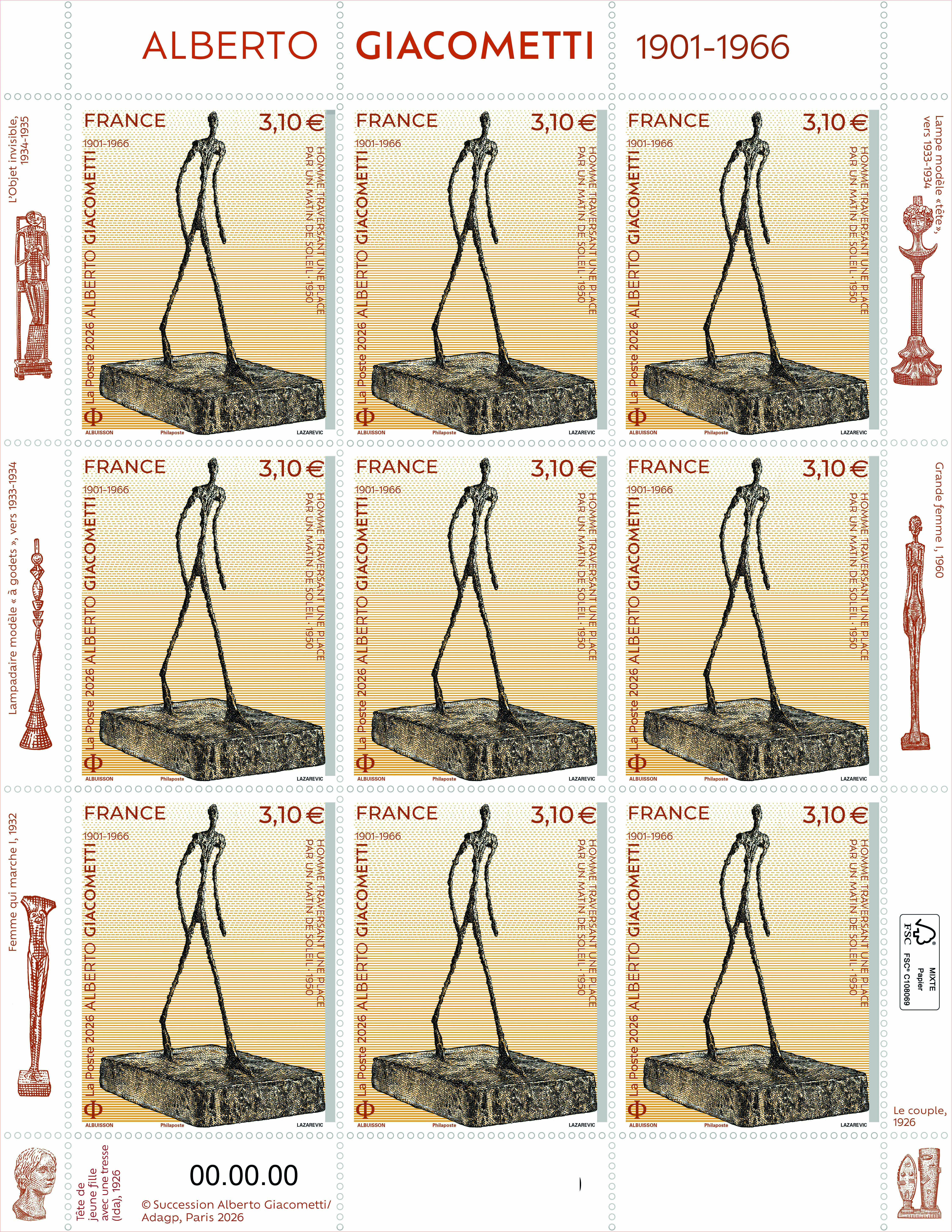 Création : Pierre Albuisson d’après photo Christie's / Artothek / La Collection, Homme traversant une place par un matin de soleil - 1950 © Succession Alberto Giacometti / Adagp, Paris 2026. Contour de feuille : Lampe modèle « tête » vers 1933-1934, Grande femme I, 1960, Le couple, 1926, L'objet invisible, 1934-1935, Lampadaire modèle « à godets », vers 1933-1934, Femme qui marche I, 1932, Tête de jeune fille avec une tresse (Ida), 1926, d'après © Succession Alberto Giacometti / Adagp, Paris 2026. Gravure : Sarah Lazarevic.