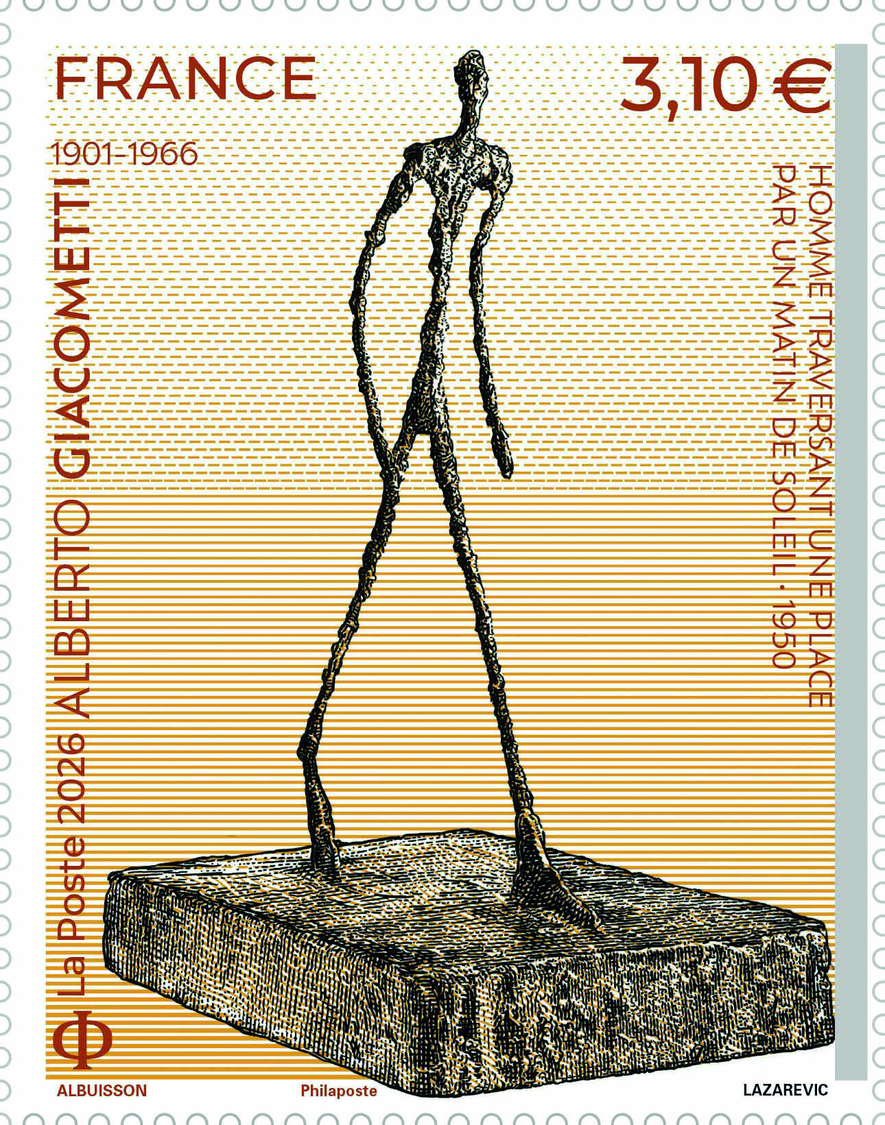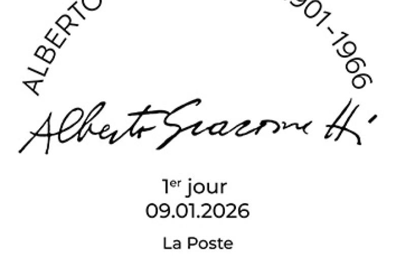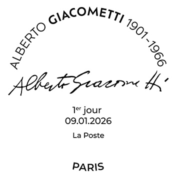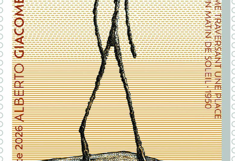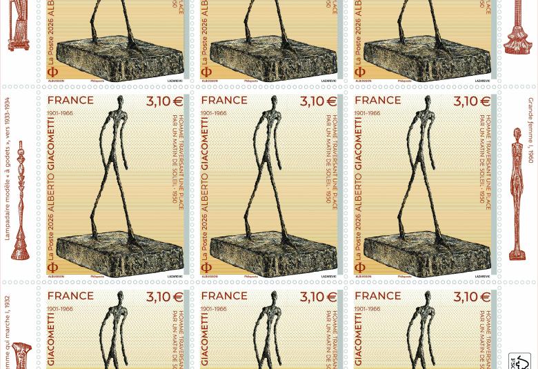 À l’occasion du 60e anniversaire de sa disparition, La Poste émet, dans le cadre de la série artistique, un timbre en hommage à Alberto Giacometti. Il est illustré par une œuvre emblématique du sculpteur « Homme traversant une place par un matin de soleil-1950 ».