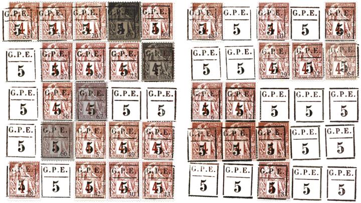 Les deux essais de la première série des timbres-poste de Guadeloupe